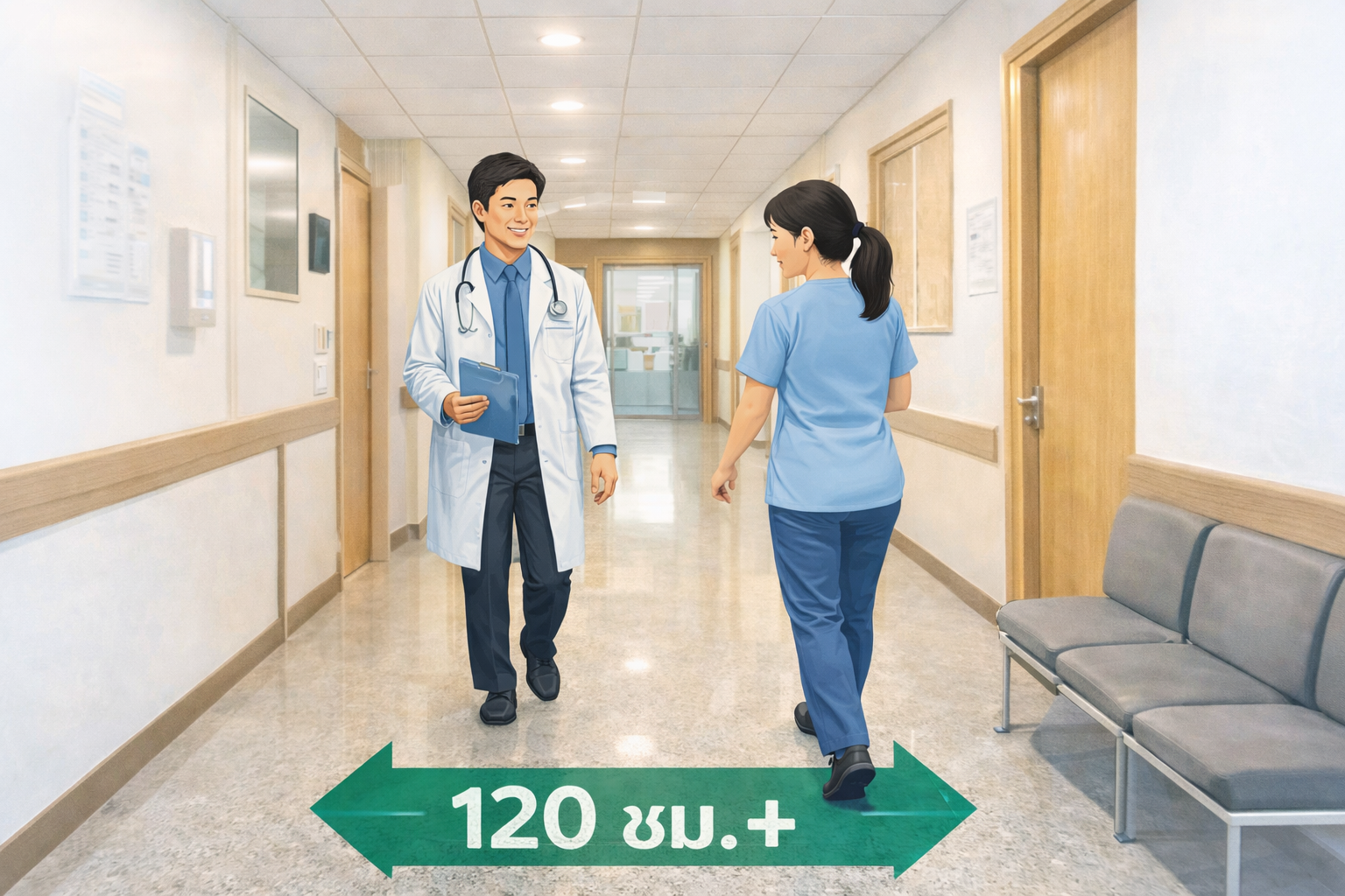 A: ควรกว้างพอให้เดินสวนกันได้ และไม่เกิดจุดอับเมื่อมีคนไข้รอหลายคน