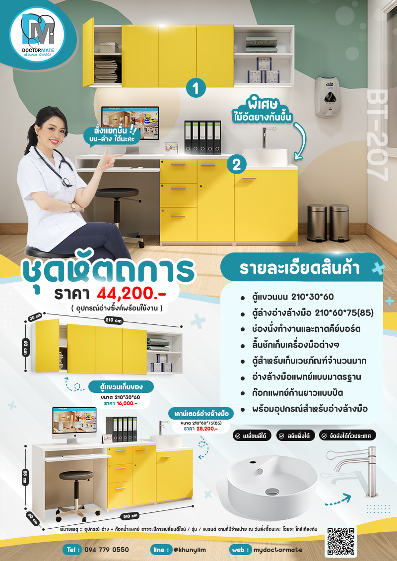 ชุดเคาน์เตอร์ห้องตรวจแบบเดียว มีทั้งที่เก็บของและอ่างล่างในตัว พร้อมตู้แขวน ประหยัดพื้นที่ ใน Set จะมีก๊อก และอุปกรณ์ต่างๆที่ใช้กับอ่างล้างมือให้ด้วยะนะคะ สามารถนำไปติดตั้งที่หน้างานได้เลย