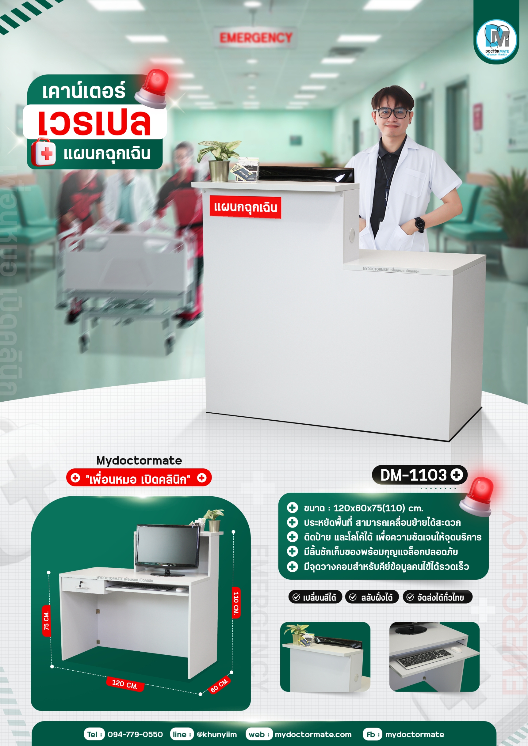 เคาน์เตอร์เวรเปล เคาน์เตอร์หน้าโรงพยาบาล เคาน์เตอร์บุรุษพยาบาล หรือจุดสำคัญสำหรับรับผู้ป่วยอย่างแผนกฉุกเฉิน ที่ต้องรับผู้ป่วยด้านหน้าอย่างทันท่วงที มีขนาดประหยัดพื้นที่ สามารถเคลื่อนย้ายได้สะดวก ในกรณีอย่างการวาง หรือการใช้งาน