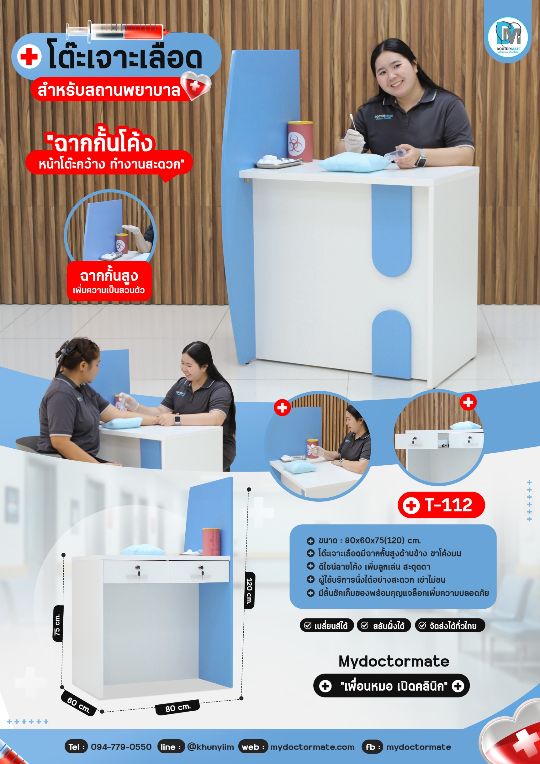 โต๊ะเจาะเลือด T-112 มีฉากกั้นเป็นสัดส่วน ดีไซน์ร่วมสมัย ขาข้างลักษณะโค้งมน ลดความกังวล สบายแต่เมื่อพบเห็น สามารถวางเดียว หรือวางต่อกันเป็นโซนได้ แข็งแรง ปลอดภัยทำงานรามรื่น