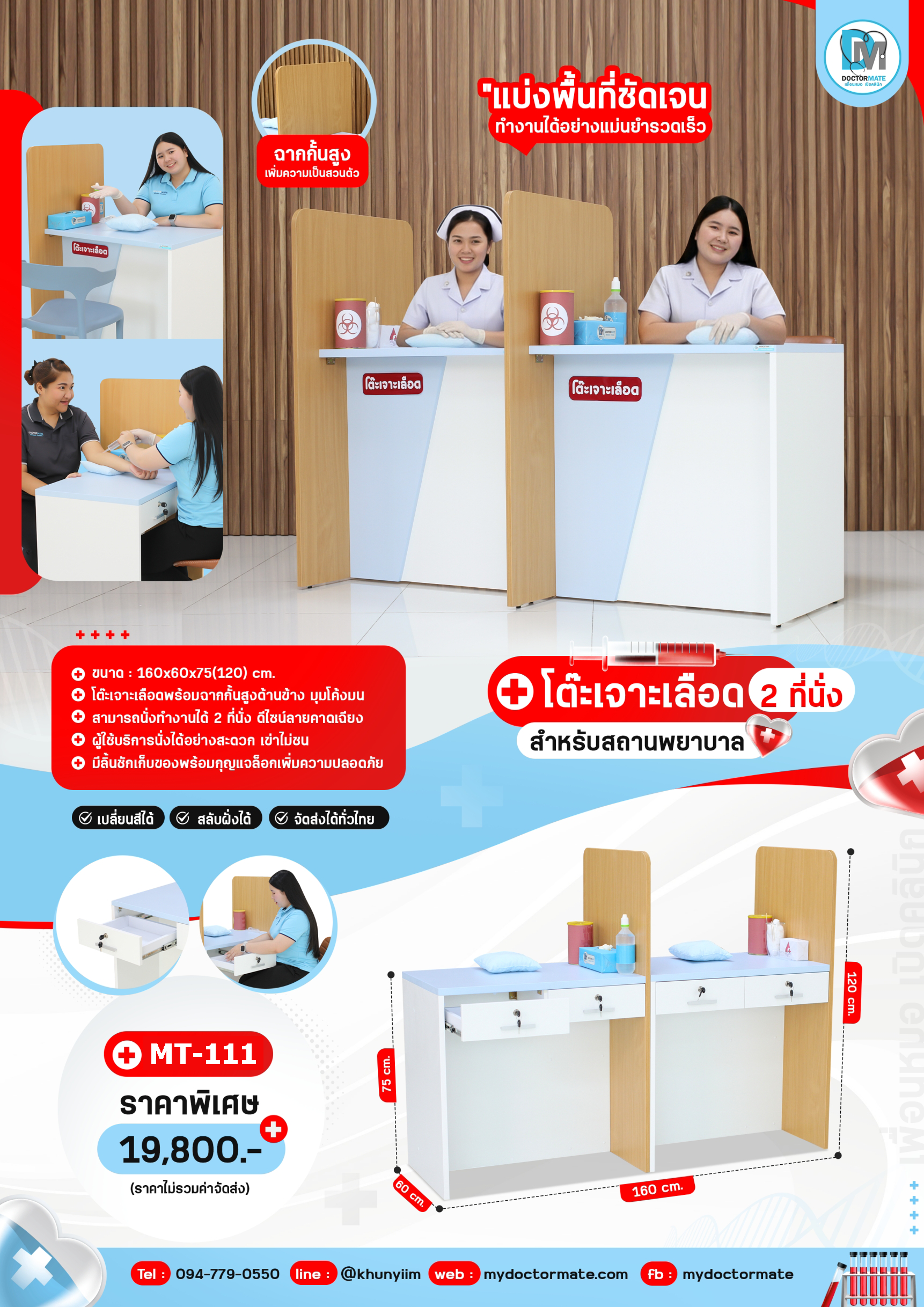 โต๊ะเจาะเลือด MT-105 สำหรับนั่งเจาะเลือด ในสถานพยาบาล ลักษณะเด่นคือขาข้างที่สูงกั้นระหว่างผู้ใชบริการ ให้เพิ่มความเป็นส่วนตัว และมีความปลอดภัยมากยิ่งขึ้น